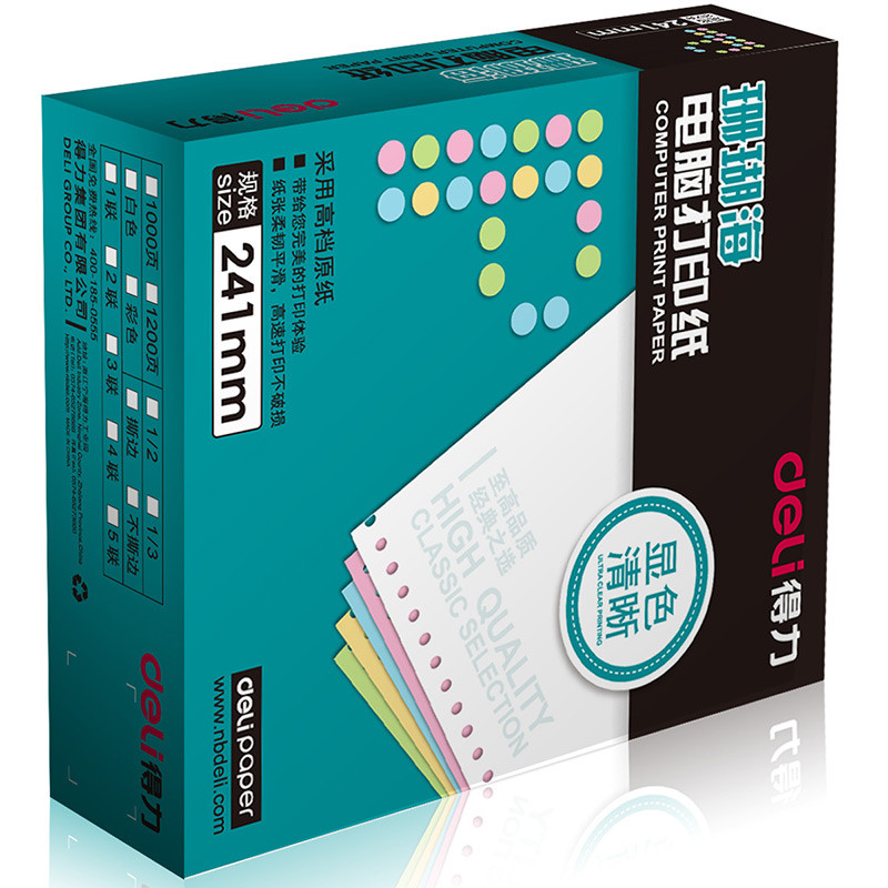 • 商品名称:得力(deli)珊瑚海彩色电脑打印纸S241-2-1/2CS二联二等分撕边80列(撕边 色序:白红 1000页/箱)