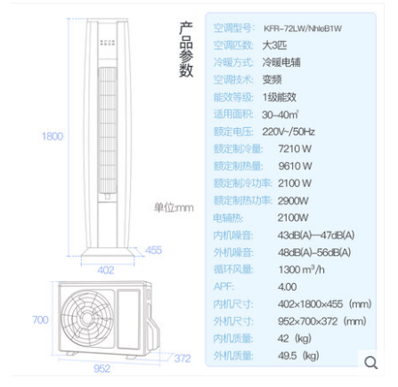 • 商品名称:Gree/格力 KFR-72LW/NhIeB1W 3匹一级能效变频冷暖客厅空调柜机