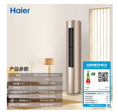 • 商品名称:Haier/海尔 KFR-72LW/18VCA21AU1 3匹一级能效变频家用空调